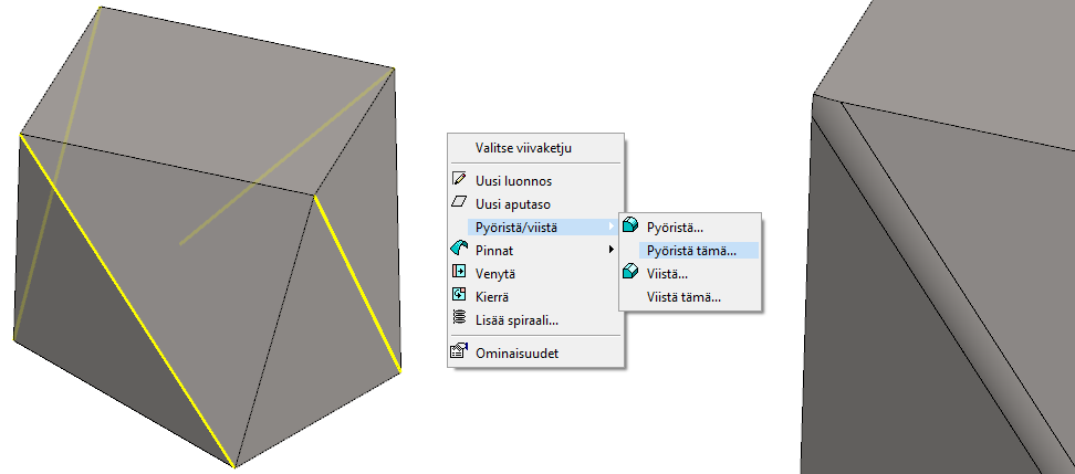 Huomaa: Jos olet mallintanut (kaikki) pinnat siten että ne rajaavat suljetun tilan avaruudesta, ohjelma ei välttämättä esittele tilannekohtaista toimintoa Muodosta kappale. Tällöin voit tehdä pyöristyksen suoraan malliin.