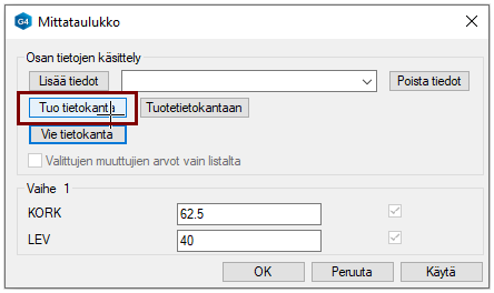 Tuo Excelissä muokattu mittataulukko osan mittataulukoksi