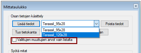 Jos valitset kohdan "Valittujen muuttujien arvot vain listalta", niin kirjastosta haetulle profiilille voit valita vain mittataulukossa olevat arvot.