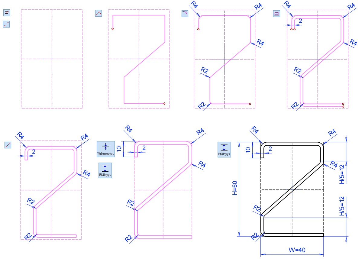 Lisää pyöristykset ja sen jälkeen Offset-toiminnolla yhdensuuntainen viivaketju.