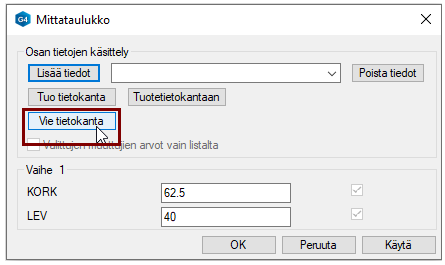 Tallenna mittataulukon tiedot: OK-painikkeella.