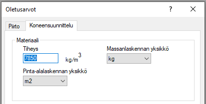 File > Järjestelmäasetukset > Koneensuunnittelu > Koneensuunnittelu-välilehti > Tiheys.