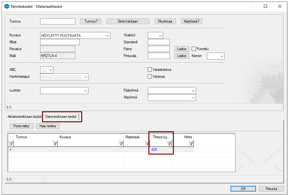 Syötä Tiheys-kenttään esim. kuusen tiheys: 420.