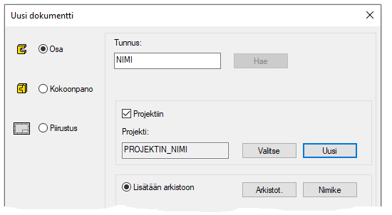 File > Uusi > Osa. (Anna nimi ja arkistotiedot ja tee uusi projekti tai valitse vanha projekti).