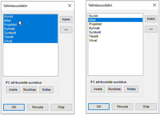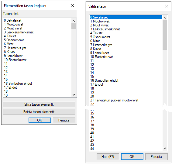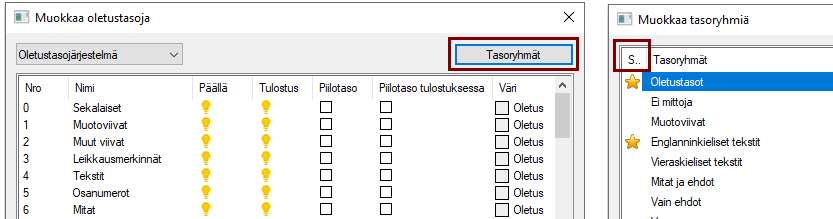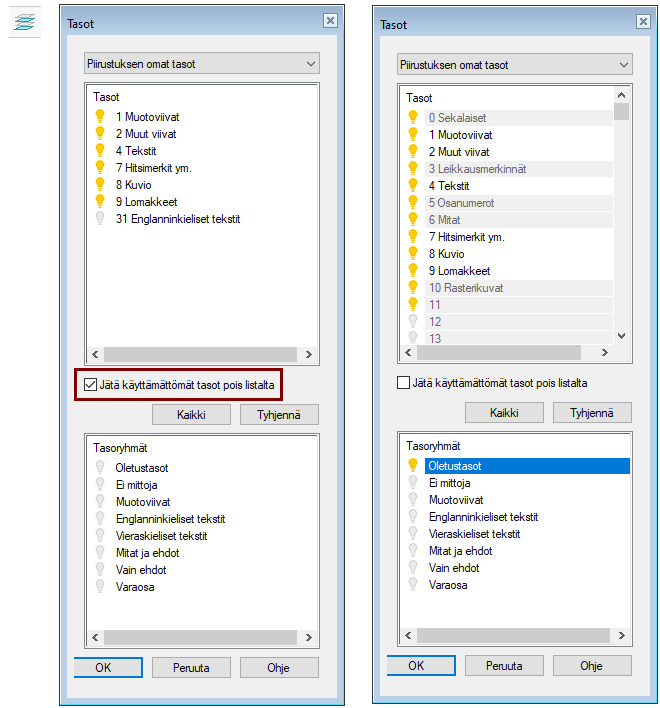 Dialogin alalaidassa on lueteltu tasoryhmiä. Niiden avulla on helppoa valita kerralla tietyt tasot näkyville ja piiloon.