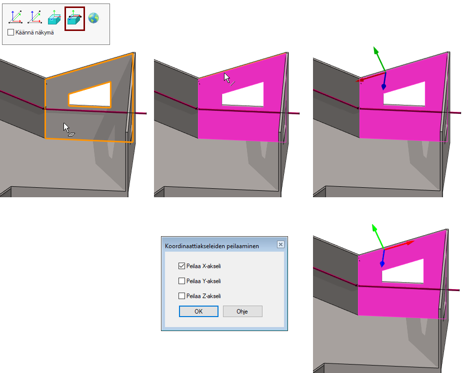 Näillä toiminnoilla katselet mallia eri suunnista. Ikään kuin "käännät mallia", vaikka malli ei näissä tapauksissa käänny, sinä vain katselet sitä eri suunnista.