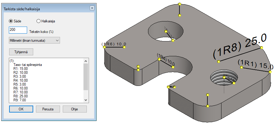 Toiminto avaa dialogin Tarkista säde/halkaisija.