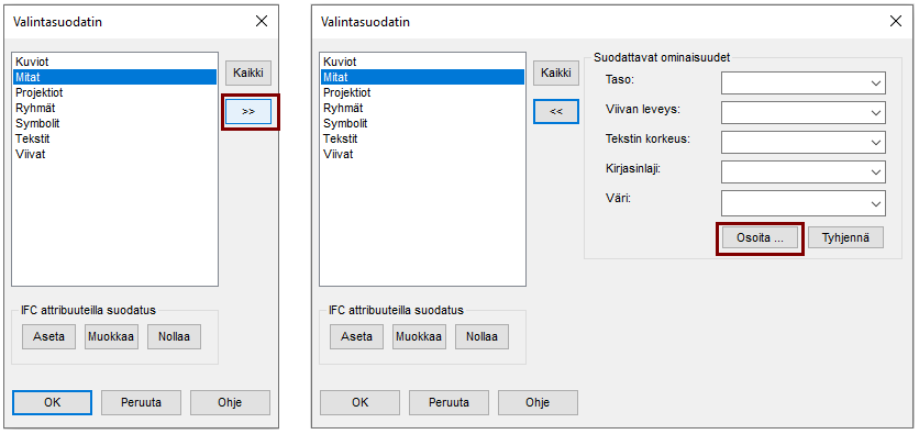 Tarvittaessa paina Osoita-painiketta ja osoita referenssielementti, jolloin osoitetun elementit ominaisuudet muodostavat suodatuksen.
