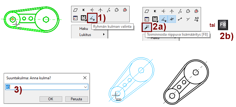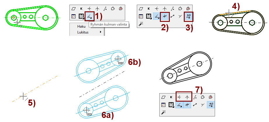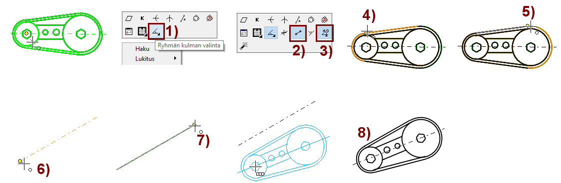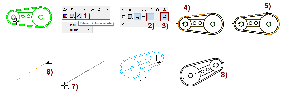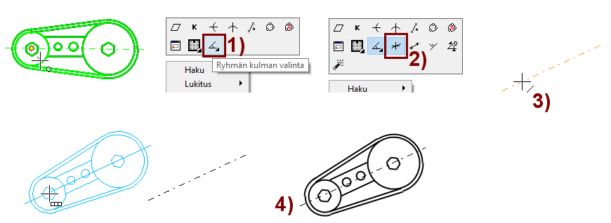 Tilannekohtainen valikko: Ryhmän kulman valinta. Kuva 1).