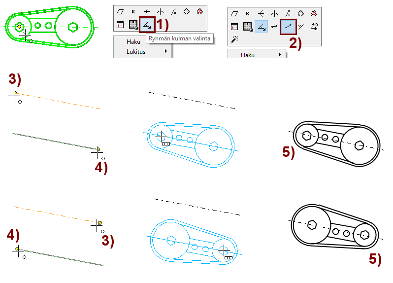 Tässä toiminnossa (useimmiten siirrettävän/kopioitavan geometrian joukosta) valitaan vertailusuora, ja sitten (useimmiten) muualta osoitetaan toinen vertailusuora, joiden perusteella geometria käännetään.