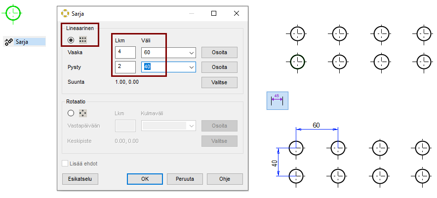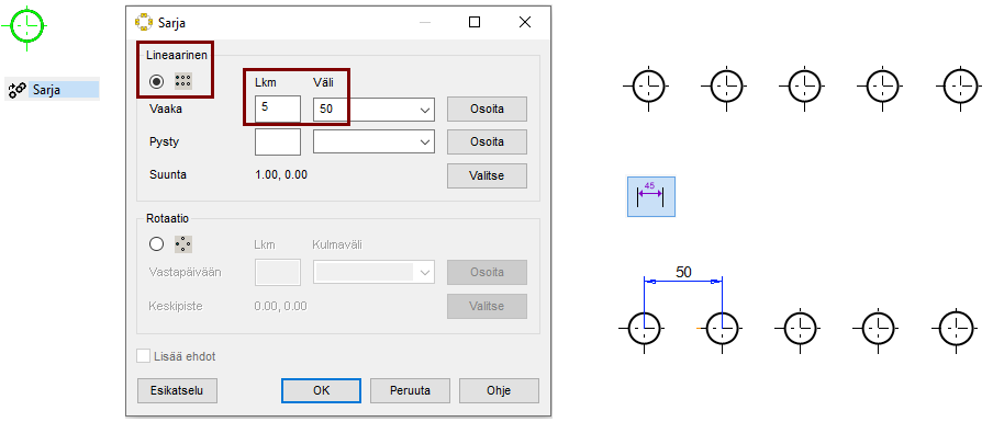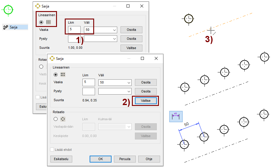 Et voi muokata piirustuksen sarjaa myöhemmin. Jos esim. sarjan jäsenten lukumäärä pitää vaihtaa, niin poista ylimääräiset sarjan jäsenet ja tee sarja uudelleen.