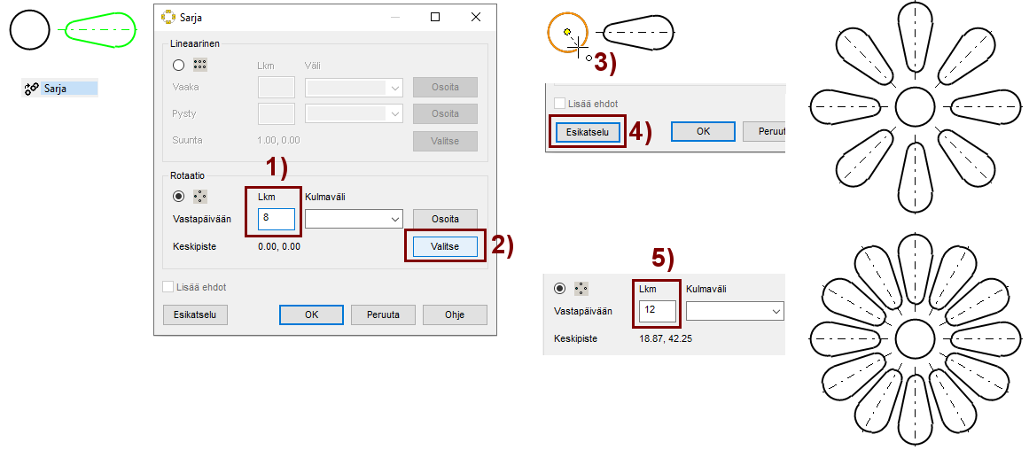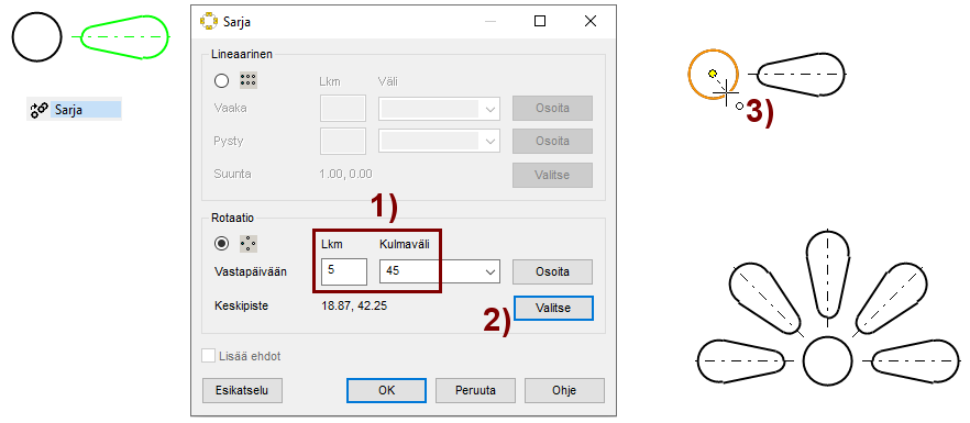 Syötä sarjan jäsenten lukumäärä ja kulmaväli, esim. 5 ja 45. Kuva 1).