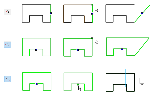 Keskimmäisellä rivillä murtoviiva on piirretty yhtenäiseksi viivaksi, joten pisteen siirto venyttää kumpaakin pisteessä kiinni olevaa viivaa.