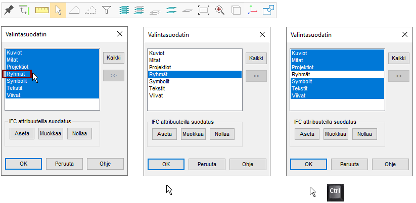 Jos haluat valita yhden tai useamman elementtityypin pois listalta tai listalle mukaan, paina Ctrl-painike pohjaan ja valitse mukaan otettava tai poistettava rivi.