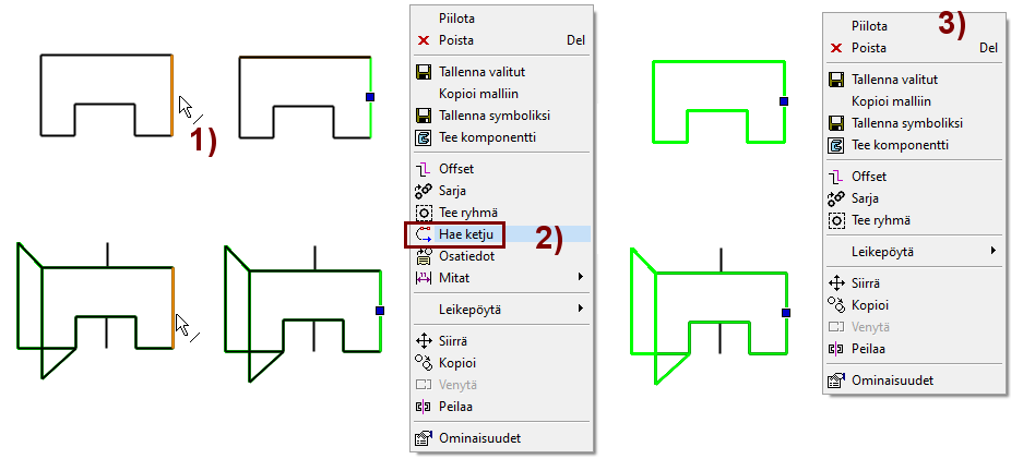 Ohjelma valitsee kaikki viivat, joilla on yhteinen päätepiste osoitetun viivan tai sen kanssa ketjussa olevan viivan kanssa.