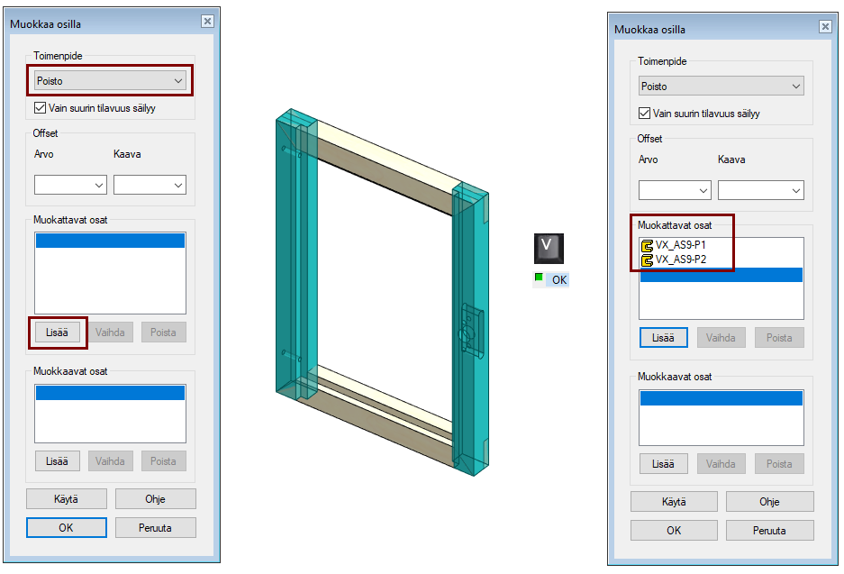 Jos näin toimit, niin alkuperäistä osaa (VX_AS9C-P2) ei koneisteta ja työstö näkyy vain tässä kokoonpanossa.