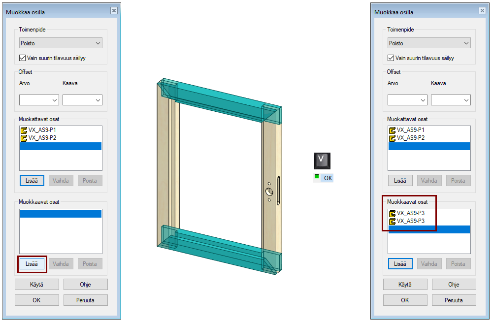 Paina Lisää-painiketta kohdan, Muokkaavat osat, alta.