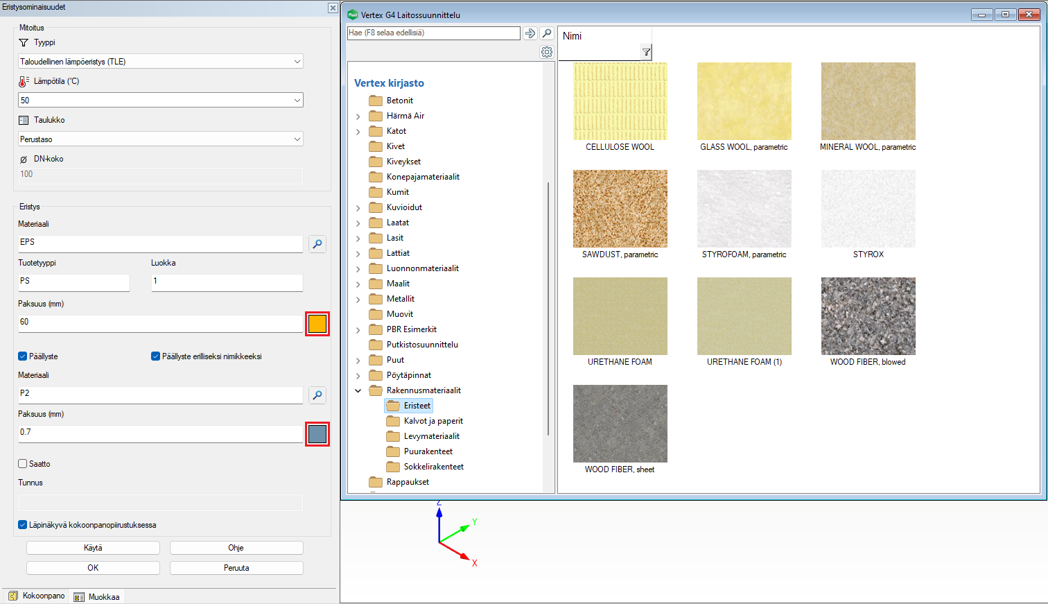 Eristeelle ja eristeen päällysteelle voidaan nyt valita visualisointimateriaali eristeiden lisäyksen käyttöliittymän kautta