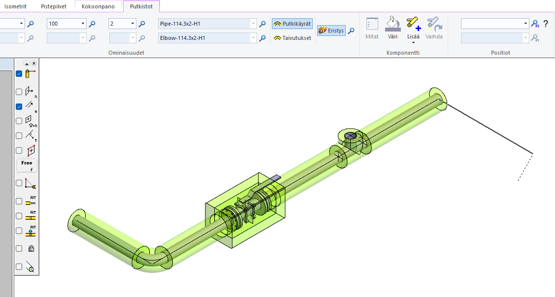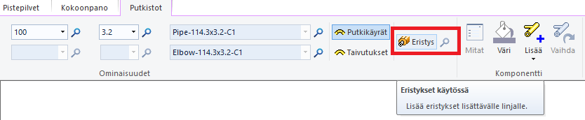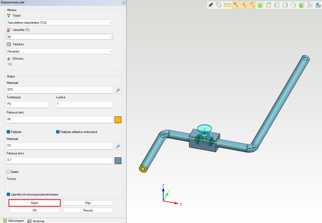 Eristeominaisuuksien hyväksynnän jälkeen eristeet lisätään malliin sitä mukaan, kun putkia, käyriä ja muita putkikomponentteja lisätään malliin. Laippaliitoskokonaisuuksien osalta eristys lisätään vasta, kun vastalaippa on lisätty tai linja päätetään yhteen laippaan. Pääset muokkaamaan jo määritettyä eristettä Valitse-napin avulla, joka on Eristykset käytössä -napin vieressä oikealla puolella.