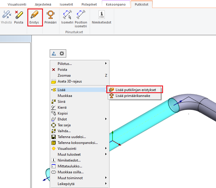 Toiminto Lisää putkilinjan eristykset on nyt valittavana myös Putkistot-välilehdeltä tai tilannekohtaisesta valikosta hiiren oikean painikkeen takaa, kun yksi putkiosa on valittuna. Käynnistettäessä toiminto tätä kautta, ohjelma automaattisesti valitsee koko liittyvän putkilinjan ja avaa dialogin Eristysominaisuudet.