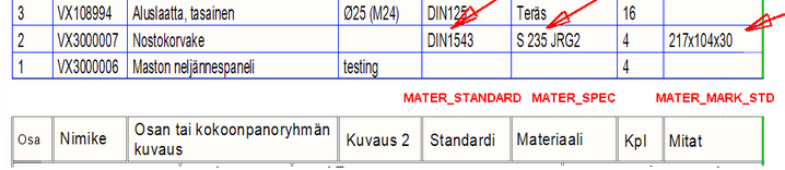 - MATER_STANDARD - materiaalinimikkeen kenttä standardi (kentän nimi tietokannassa STANDARD)