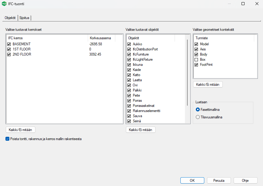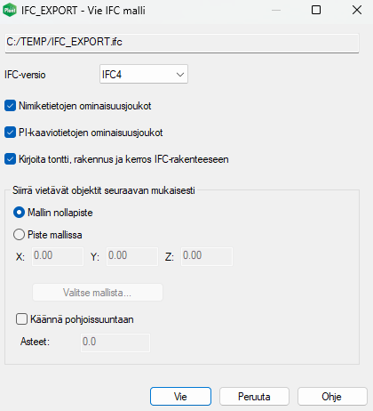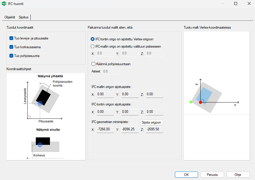 Sinulla on yhä mahdollisuus vaikuttaa mihin koordinaatteihin IFC-tiedosto kirjoitetaan. Selkeytimme ikkunassa käytettäviä termejä, jotta sinun on helpompi saavuttaa haluttu lopputulos.