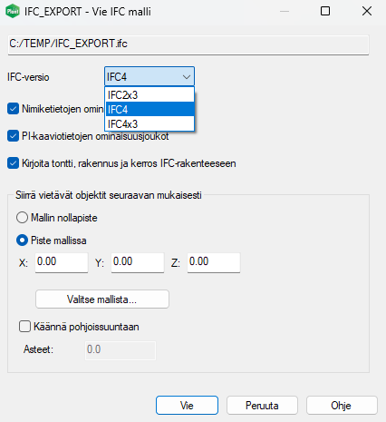 Uudistimme IFC-viennin keskusteluikkunan. Voit nyt itse valita käytettävän IFC-version pudotusvalikon avulla, kun muutat Vertex-mallin IFC-tiedostoksi.