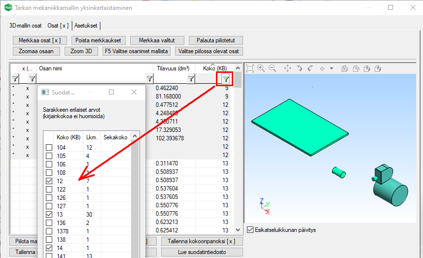 - Parannuksia osien arvioidun koon laskentaan.