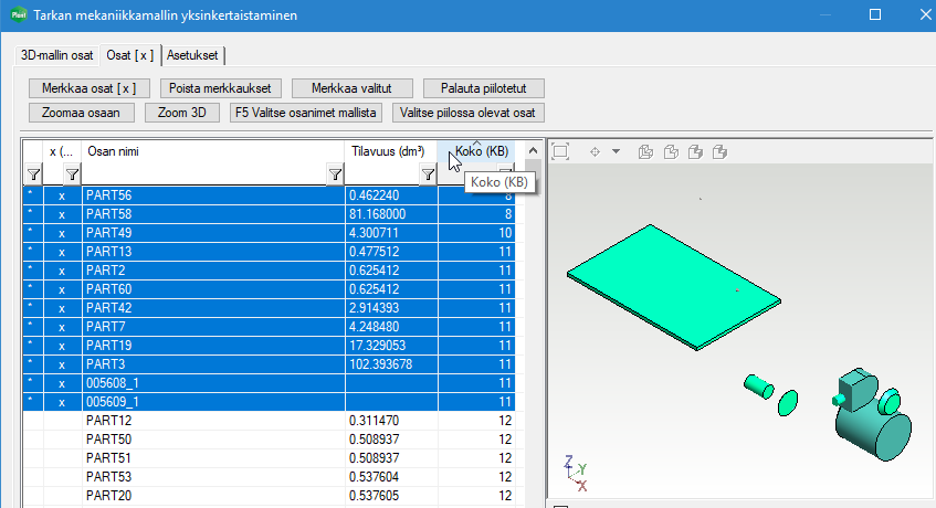 Voit järjestää osat listalle tilavuuden tai tiedostokoon perusteella. Listalta voidaan suoraan valita poistettavaksi esimerkiksi listan alussa olevat osat. Näet omassa ikkunassan poistettavaksi valitut osat.