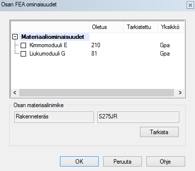 Voit muuttaa materiaaliarvot toisiksi painamalla Tarkista ja valitsemalla tietokannasta haluttu materiaali.