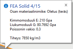 Pidä kursoria aktiivisen tutkimuksen osan päällä, niin näet vihjekuplassa osaan liittyvää FEA-tietoa. Jotta vihjekupla näkyy, täytyy Asetukset > Piirustukset, mallit > Näkymä > Näytä geometriavihje kohdistimessa -asetus olla päällä.