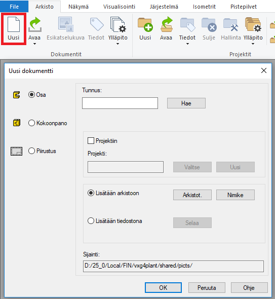 Avaa uusi osamalli: Arkisto-välilehti > Luo uusi dokumentti > Osa > OK.