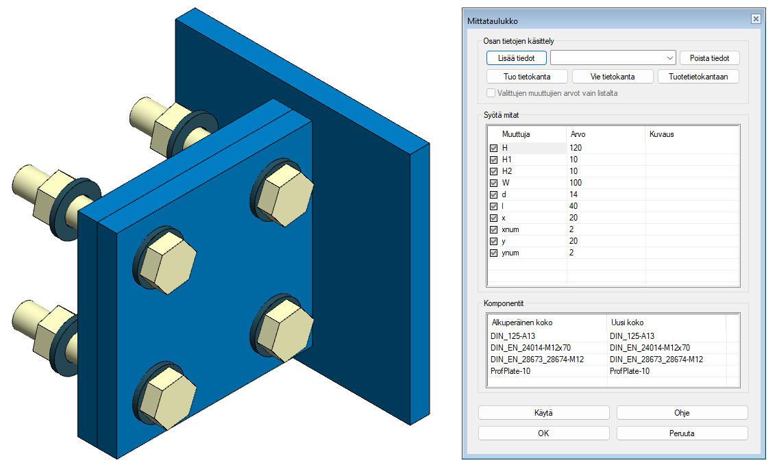 Komponentin paikoituksen jälkeen avautuvassa mittataulukossa voidaan muokata sekä liitoksen yleisiä mittoja että vaihtaa pulttien, muttereiden ja aluslevyjen kokoa sekä vahvikelevyjen paksuutta. Profiilien trimmaukset suoritetaan vasta, kun mittataulukon tiedot on hyväksytty. Kiinnitystarvikkeiden avulla voidaan suorittaa työstöt ulkoiseen geometriaan.