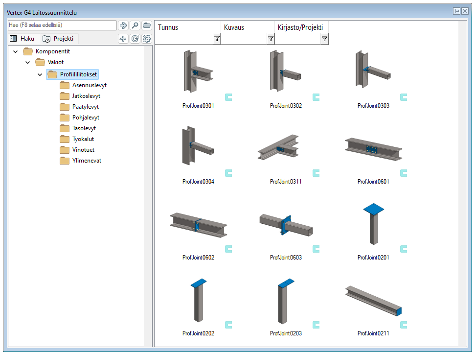 Profiililiitoksissa käytettävät komponentit löytyvät komponenttikirjaston Profiililiitokset-hakemistosta. Sieltä löytyy erityyppisiä liitoskomponentteja jaoteltuna liitostavan mukaisesti omiin alihakemistoihin: