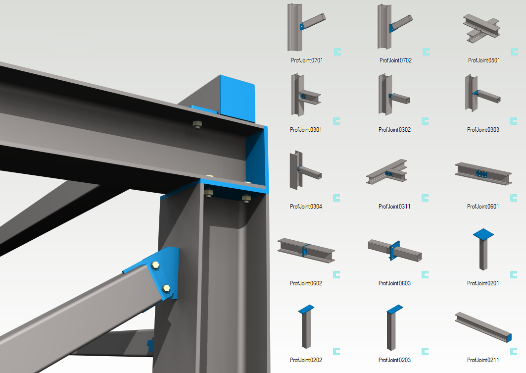 Kirjastossa olevat liitokset sisältävät tarvittavat kiinnittimet ja teräsprofiilit erilaisiin kiinnitystilanteisiin.