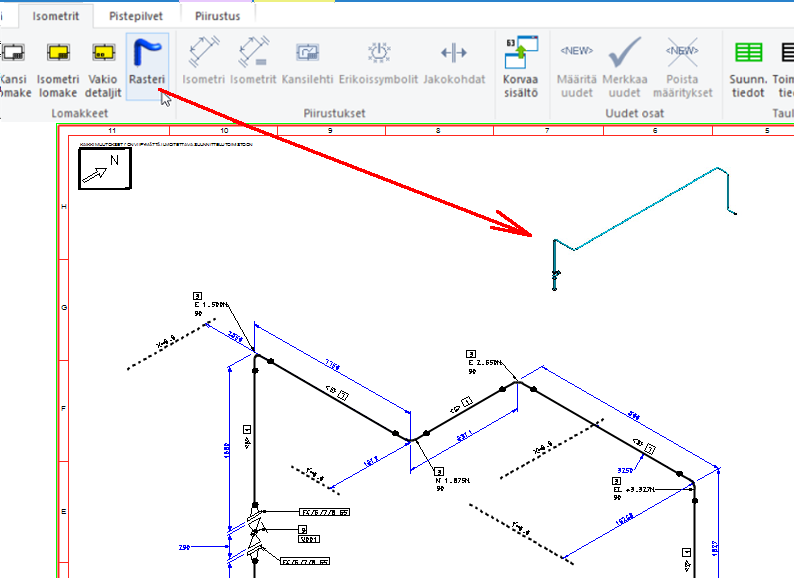 Putkilinjan rasterikuva on mahdollista lisätä juuri ajettuun isometripiirustukseen. Kun isometri on syntynyt, voit käyttää toimintoa Rasteri lisätäksesi rasterikuvan putkilinjasta. Voit asettaa erikseen kuvan sijainnin ja skaalata kuvaa.