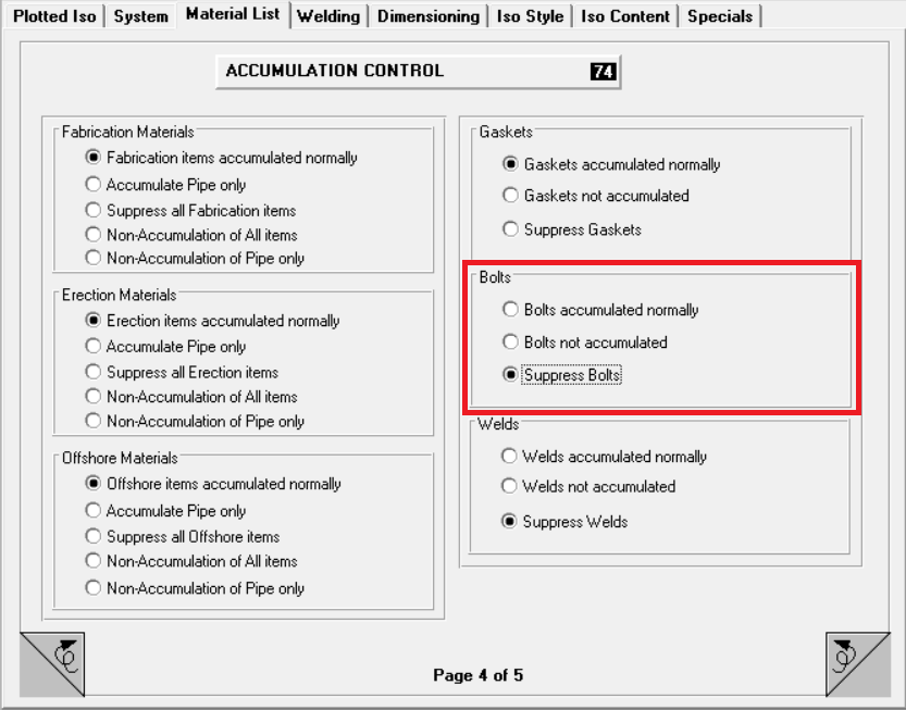 Voit nyt jättä haluttaessa pultit pois isometrin osaluettelosta. Tällä kuvassa näkyvällä, Isogenin asetuksista löytyvällä kytkimellä, ei ollut vaikutusta aikaisemmissa versioissa pulttien listalle tuloon. (PLANT-3833)