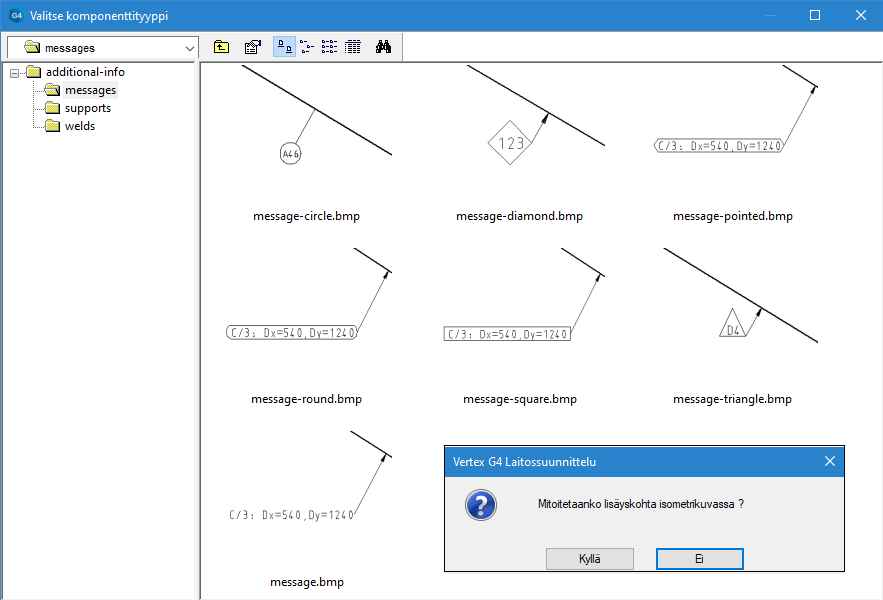 Nyt on mahdollista valita isometripiirustukseen mitoitus päälle myös putkilinjoille lisätyille viestisymboleille. Ohjelma kysyy erikoissymbolin lisäyksen yhteydessä halutaanko symboli mitoittaa isometrissä. (PLANT-2357)