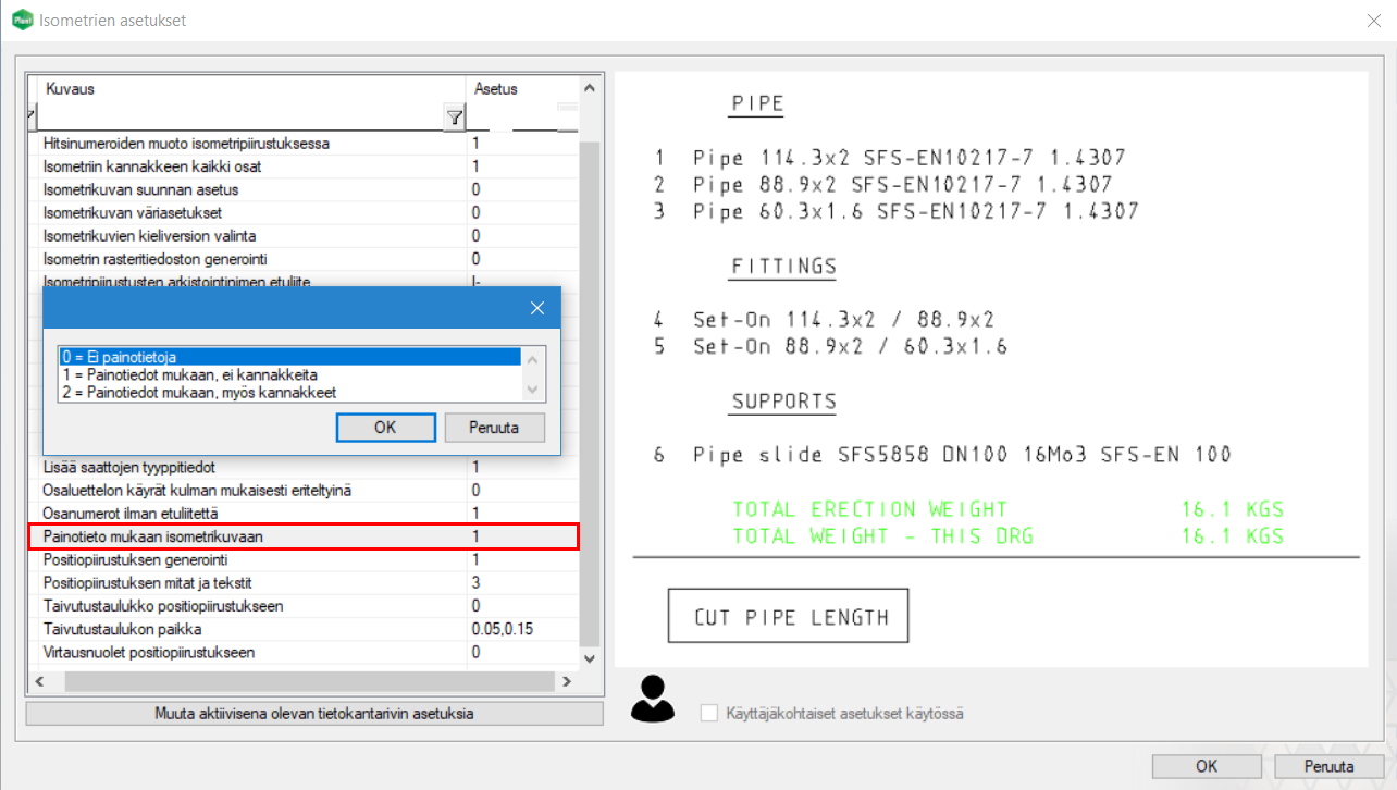 Laippaliitoksen lisäosien painoa ei ole tullut aiemmissa versioissa isometriin mukaan. Versiossa 2021 ohjelma lisää nyt kannakkeiden ja laippojen kiinnitysosien painon aina lisäysvaiheessa mallin attribuuttitietoihin. Edelleen painot lasketaan mukaan myös isometrin kokonaispainoon. Huom! Kannakkeiden osalta painon laskenta isometriin on valittavissa asetuksissa.
