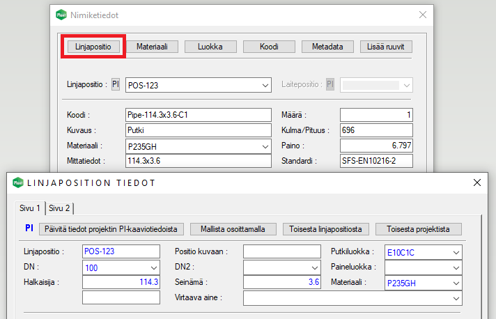 Linjaposition tietojen täydentämistä on helpotettu. Ohjelma lisää putkilinjan perustiedot nyt automaattisesti. (PLANT-3406)