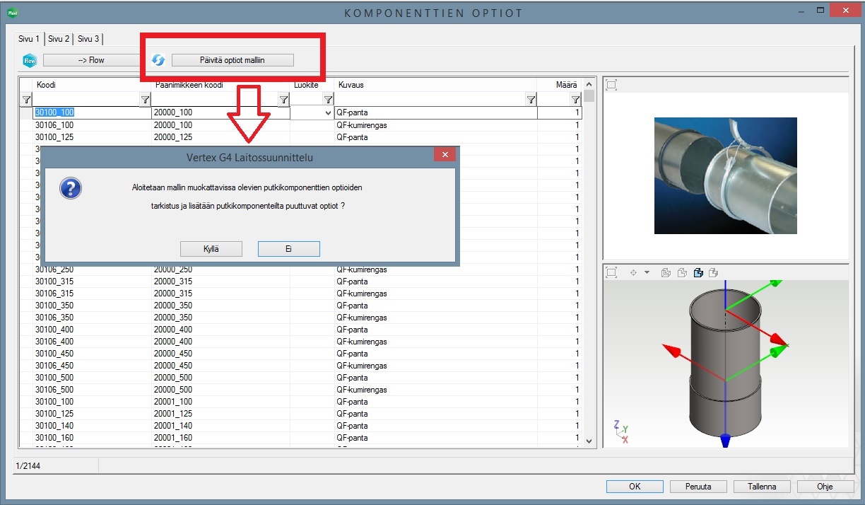 Jos PIPEOPTIONS-tietokantaan tehdään lisäyksiä sen jälkeen, kun putki- tai kanavalinja on reititetty, saadaan tiedot päivittymään malliin. Toiminnon käynnistysnapin löydät optiotietokannan näytöstä. (PLANT-3545)