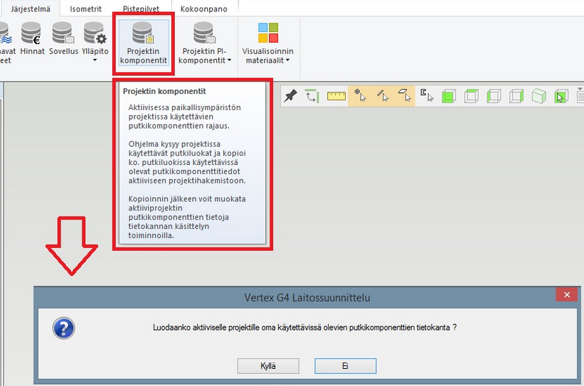 Uusi toiminto jonka avulla voit määritellä projektissa käytettävät putkiluokat. Putkilinjaa reititettäessä esimerkiksi voidaan valita vain projektiin määritellyistä putkiluokista. Toiminnon käynnistyttyä projektissa käytettävät putkiluokat valitaan listalta ja ohjelma luo projektihakemistoon oman projektikohtaisen putkikomponenttikirjaston. (PLANT-3404)
