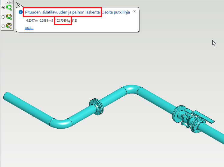 Laskettu paino (kg) näkyy puhekuplassa pituuden ja sisätilavuuden jälkeen. Laskettu paino on vain valittujen putki- tai kanavakomponenttien yhteispaino lisäosat mukaan lukien eikä siis ota huomioon putkiston sisällä virtaavaa ainetta. (PLANT-3520)