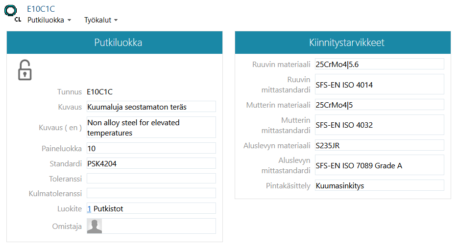 Näiden kahden tietokannan yhteen sulauttaminen mahdollistaa jatkossa putkiluokkien ylläpidon suoraan Flow'sta käsin. Putkiluokan kortille on Flow'hun lisätty kentät kiinnitystarvikkeille. Luokkien ylläpito onnistuu Flow'n selainkäyttöliittymän avulla. (Vertex ID: PLANT-4401)