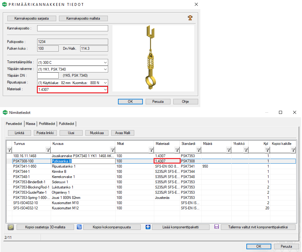Lisättäessä riippu- ja jousikannakkeita, niihin kuuluvat sanka- ja liukukannatinosat saavat myös sen materiaalin, joka kannakkeelle on syötetty. (Vertex ID: PLANT-4380)