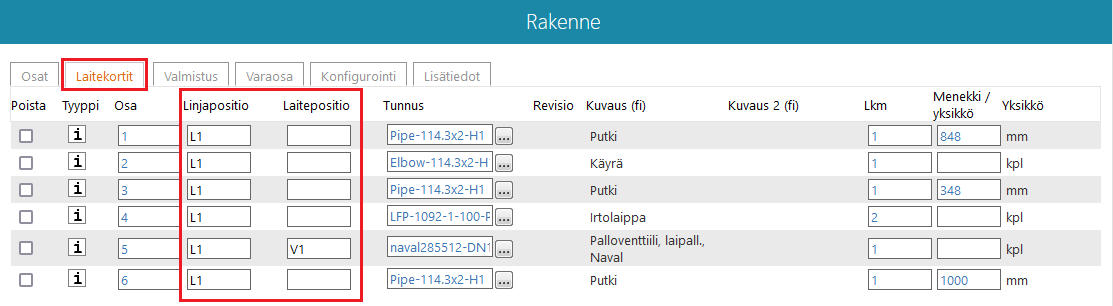 Nyt sekä linjapositiot että varustepositiot menevät omiin kenttiinsä myös Flow'n nimikerakenteessa, kun putkistoja mallinnetaan nimikkeellisiin kokoonpanoihin. (Vertex ID: PLANT-4427)