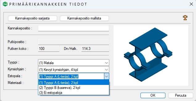 Tarkastimme ja päivitimme myös kiinnitystarvikkeiden materiaalit vastaamaan tuoreimpia PSK-putkiluokkastandardeja. Niille putkiluokille, joilla kiinnitystarvikkeiden materiaali vaihtelee vallitsevien olosuhteiden, kuten lämpötilan mukaan, lisäsimme kummankin materiaalivaihtoehdon saataville Ruuvien pituuden laskentaan. Yleisempi tilanne on oletus-materiaali. Voit vaihtaa materiaalin pudotusvalikon avulla kuten alla olevassa kuvassa. (Vertex ID: PLANT-4401)
