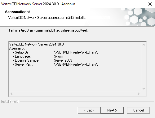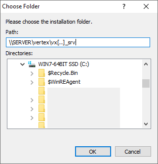 Huomaa, että jos työasemalla on jo käytössä polku C:\vx[..] eli siihen on asennettu paikallinen Vertex-asennus, anna sellainen polku, joka ei ole ristiriidassa nykyisten asennusten kanssa.