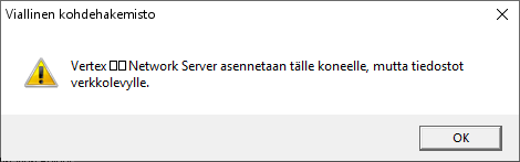 Jos teet palvelinasennuksen työasemalta, saat viereisen viestin. Tällöin ohjelman asennukseen liittyvät rekisterimerkinnät tehdään työasemalle, mutta kaikki tiedostot asennetaan palvelimelle. Tällaisen asennuksen seurauksena Vertexin pääversion päivitys täytyy tehdä tältä samalta työasemalta, miltä se asennettiinkin.