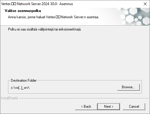 - Asennusohjelman oletuskansio on C:\vx[..]_srv, mutta tämä tulee vaihtaa.